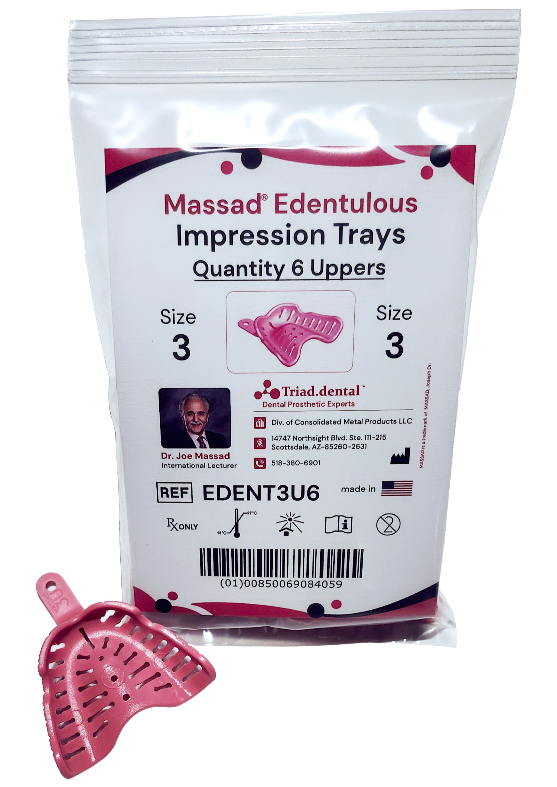 Massad Edentulous Impression Trays, developed by Dr. Joe Massad, are available in 5 sizes, upper and lower, and packaged 6 trays per size-arch. They produce final edentulous impressions in 1 appointment that capture key anatomical features.