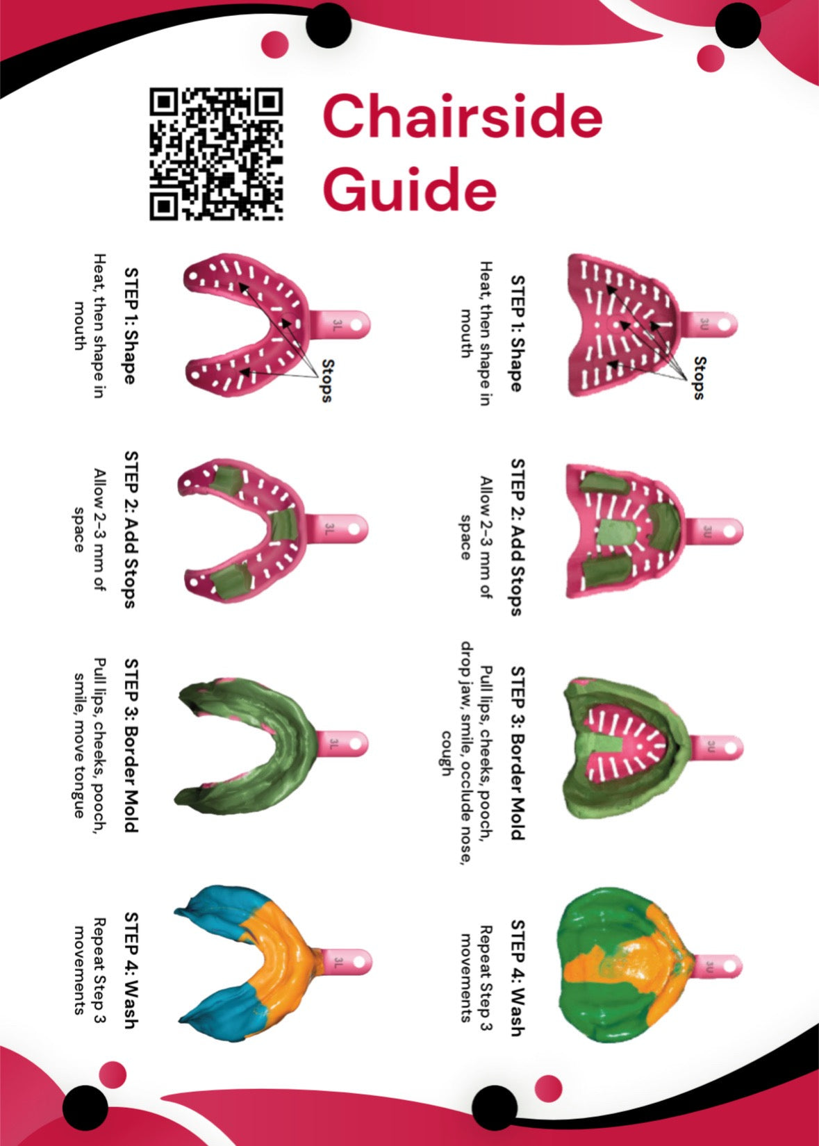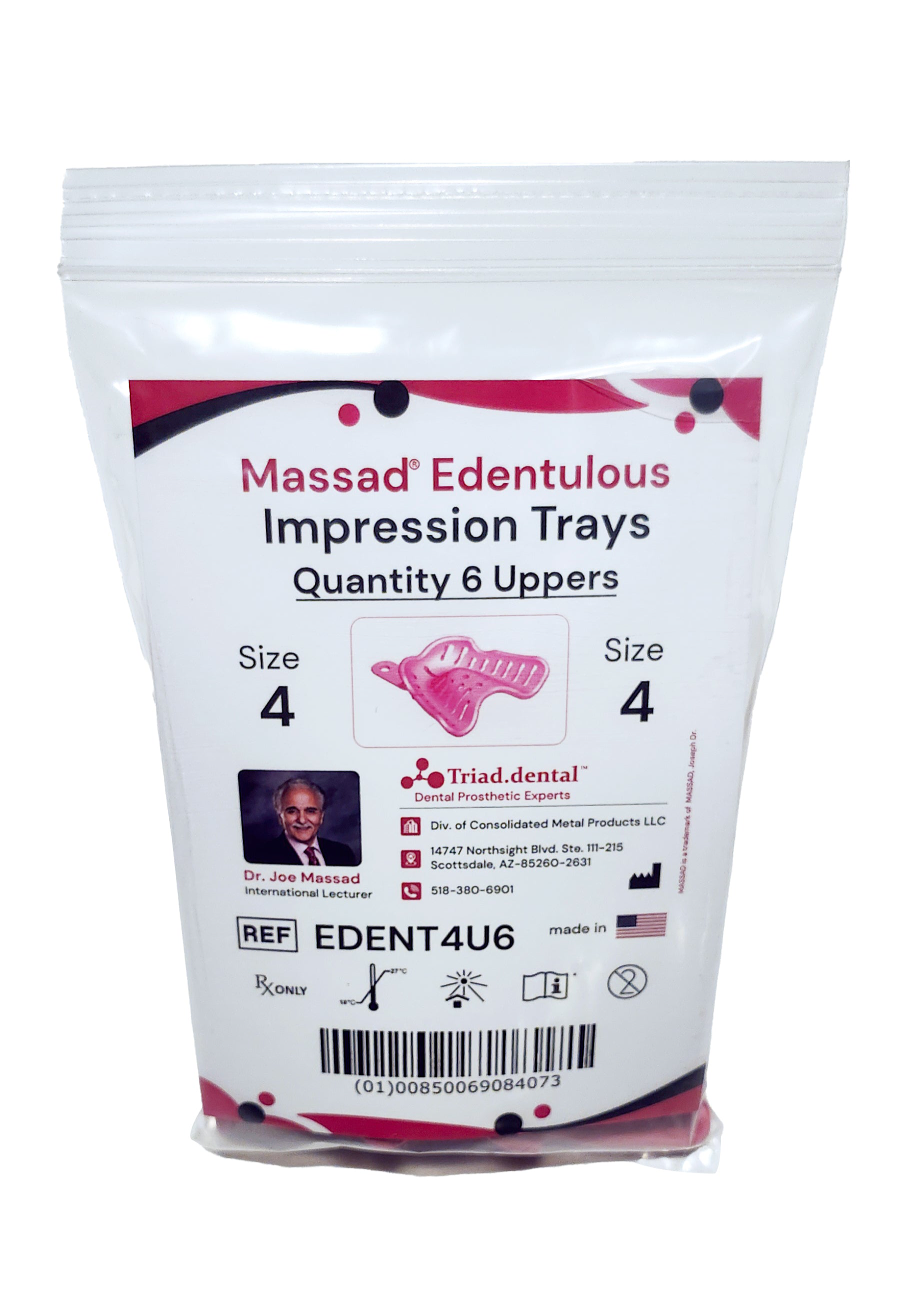 Massad Edentulous Impression Trays, developed by Dr. Joe Massad, are available in 5 sizes, upper and lower, and packaged 6 trays per size-arch. They produce final edentulous impressions in 1 appointment that capture key anatomical features.