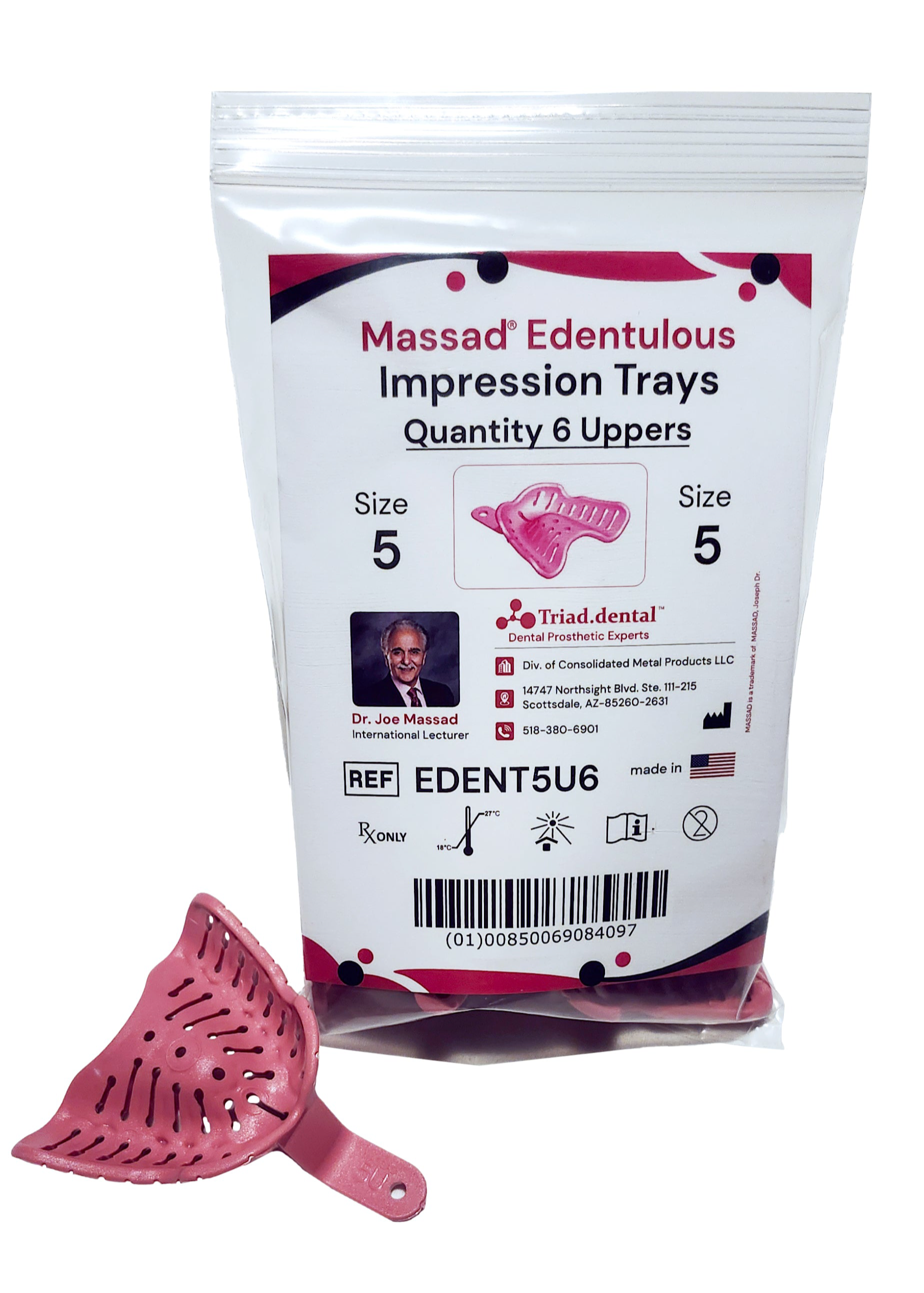 Massad Edentulous Impression Trays, developed by Dr. Joe Massad, are available in 5 sizes, upper and lower, and packaged 6 trays per size-arch. They produce final edentulous impressions in 1 appointment that capture key anatomical features.
